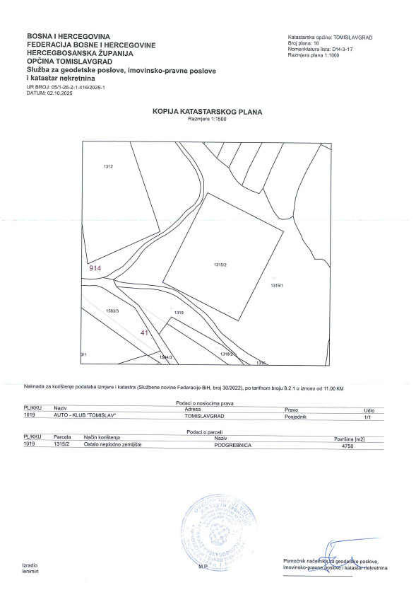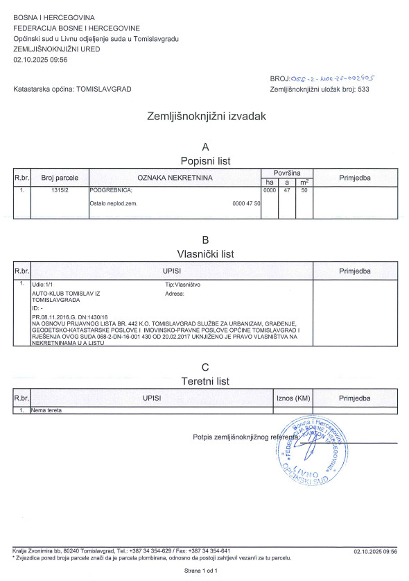 Upravni odbor Auto kluba “Tomislav” raspisao je natječaj o prodaji nekretnine, zemljišta na adresi Ivana Mamića Ićole bb u Tomislavgradu. Parcela je označene kao k.č. broj 1315/2 prikazana u PL br. 1019 u Katastru općine Tomislavgrad i ZK Ulošku br. 533 Zemljišno knjižnog ureda u Tomislavgradu, ukupne površine 4.750 m2. Prostor površine 1.320 m2 je asfaliran i služio je kao poligon za obuku vozača.