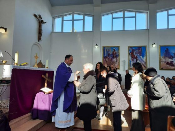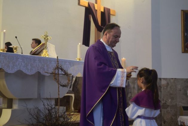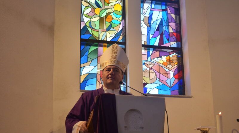 U suslavlju sa župnikom fra Stipom, predvodio misno slavlje u 9.30 sati. Crkva je bila posve ispunjena vjernicima. Biskup je u propovijedi posebno naglasio potrebu našeg autentičnog življenja vjere, ono počiva na preobrazbi i radu na sebi, a Crkva nas u korizmenom vremenu na to posebno poziva. Misna čitanja pročitale su Kristina Ćerdić i Karmen Čuić, a molitvu vjernika Gabriela Bagarić. Misno slavlje skaldnim pjevanjem je po prvi puta animirao novoosnovani zbor crkve sv. Ante u Brišniku, pod ravnanjem gosp. Pere Tokića.