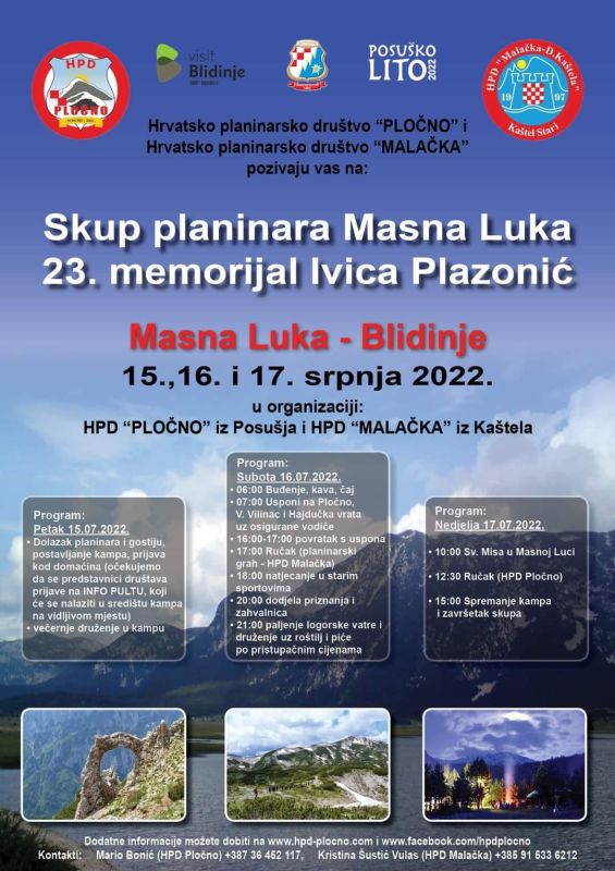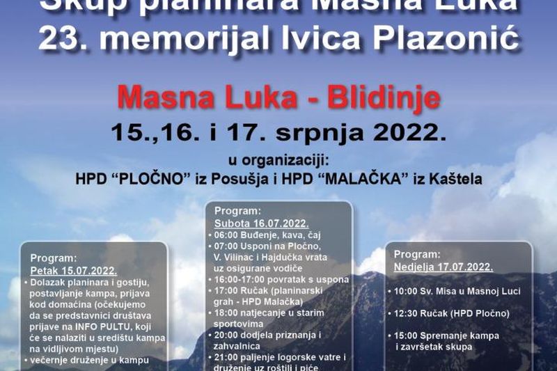Ovoga vikenda, 15., 16. i 17. srpnja u Masnoj Luci se održava jedan od najvećih skupova planinara na ovim prostorima ”Memorijal Ivica Plazonić“ u organizaciji Hrvatskog planinarskog društva „Pločno“ Posušje. Već godinama u suorganizaciji s Hrvatskim planinarskim društvom „Malačka“ iz Kaštela, na Blidinju se okupi doista veliki broj planinara iz svih krajeva Bosne i Hercegovine i Hrvatske,…