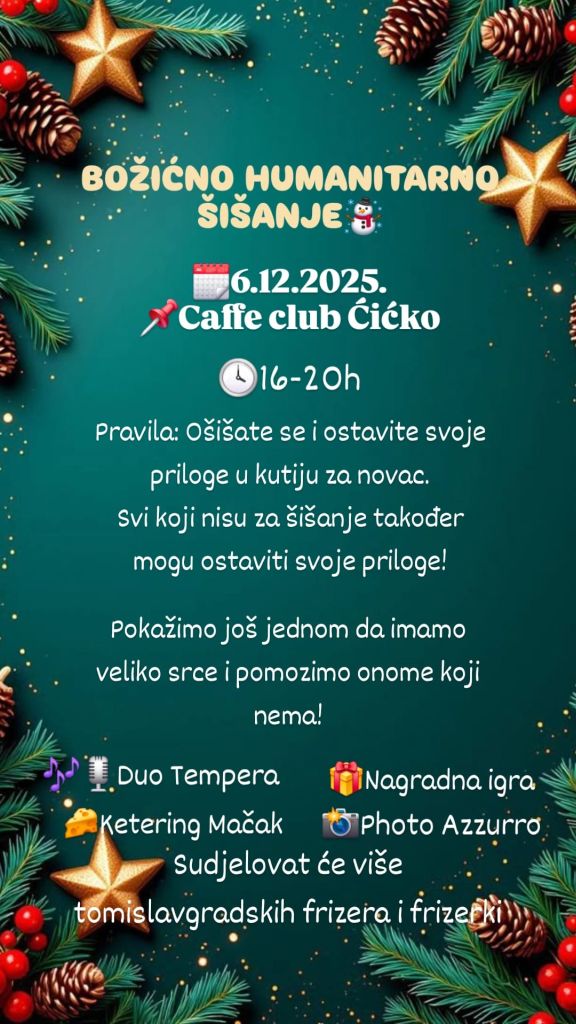 Svi koji žele sudjelovati i poduprijeti navedenu humanitarnu akciju moći će svoje novčane priloge ostaviti u kutiju koja će biti postavljena na ulazu u kafić. Sav prihod namijenjen je potrebitima o kojima skrbi Kap ljubavi Tomislavgrad. Stoga, očekujemo vas u u subotu, 6. prosinca od 16 do 20 sati u Caffe clubu Ćićko!