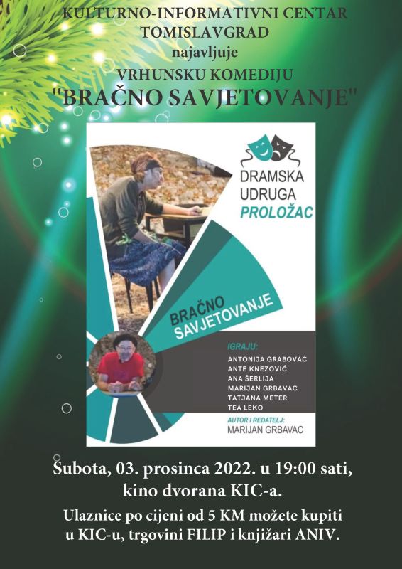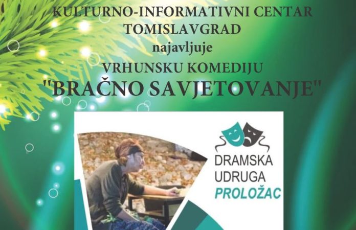 Za prve dane prosinca za Vas smo pripremili vrhunsku komediju ”BRAČNO SAVJETOVANJE” autora i redatelja Marijana Grbavca, u izvedbi Dramske udruge Proložac.