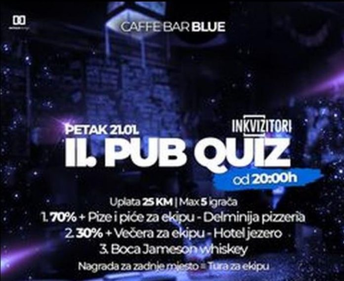 Naslovnica Najnovije vijesti Caffe bar Blue organizira II. pub kviz Najnovije vijesti Caffe bar Blue organizira II. pub kviz Objavio TC - 18. siječnja 2022. Caffe bar Blue u Tomislavgradu organizira II. pub kviz koji će se održati u petak, 21. siječanja s početkom u 20 sati. Uplata po ekipi iznosi 25 KM. Detaljnije informacije na plakatu. VEZANI ČLANCIVIŠE OD AUTORA Matica hrvatska Travnik ustanovljuje nagradu „Ivo Andrić“ Učenici Srednje glazbene škole Tomislavgrad briljirali na Federalnom natjecanju u Srebreniku U Livnu će se graditi nova bolnica, investicija vrijedna 48 milijuna eura Matica hrvatska Travnik ustanovljuje nagradu „Ivo Andrić“ 17. travnja 2026. Učenici Srednje glazbene škole Tomislavgrad briljirali na Federalnom natjecanju u Srebreniku 17. travnja 2026. U Livnu će se graditi nova bolnica, investicija vrijedna 48 milijuna... 17. travnja 2026. Ovo su iznosi minimalnih mirovina u FBiH za umirovljenike s 40,... 17. travnja 2026. Memorijal „fra Stjepan Petar Krasić“ i specijalna izložba tornjaka „Kup kralja... 17. travnja 2026.