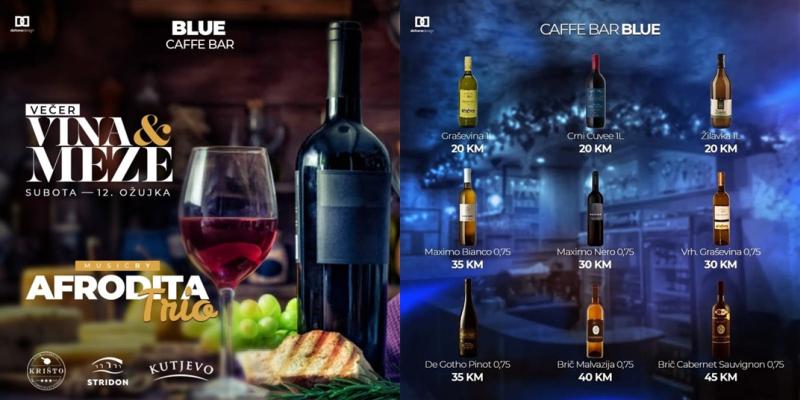 Ove subote caffe bar Blue organizira večer vina i meze. Za dobru atmosferu pobrinut će se Afrodita Trio!