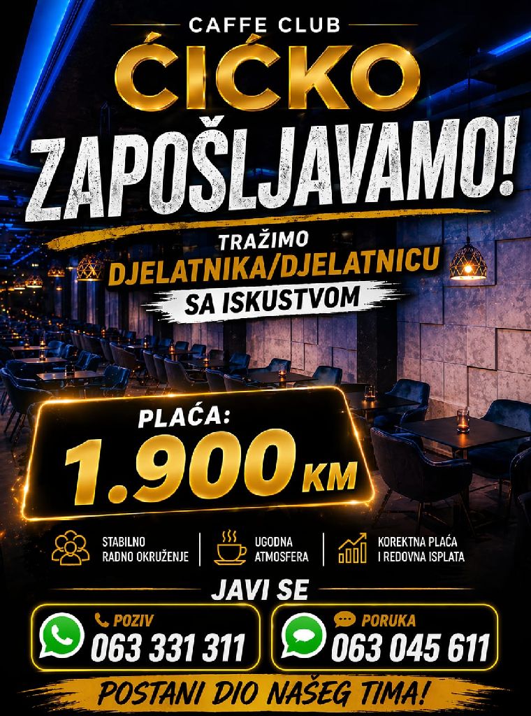 Caffe Club Ćićko zapošljava djelatnika/djelatnicu s iskustvom.