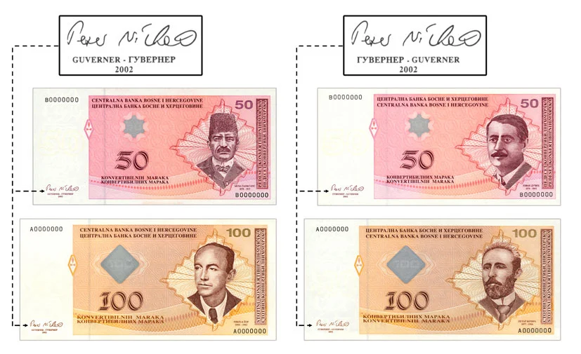 Počevši od 1. siječnja 2025. godine navedena izdanja novčanica KM prestaju biti zakonsko sredstvo plaćanja i ne mogu se primati u prometu za podmirivanje bilo kakvih obaveza, te podliježu isključivo procesu zamjene kao novčanice povučene iz optjecaja.