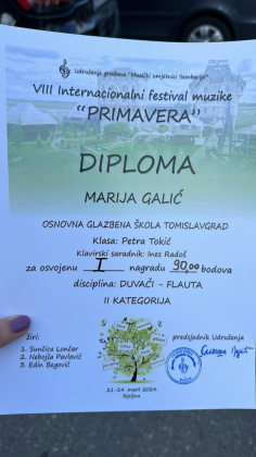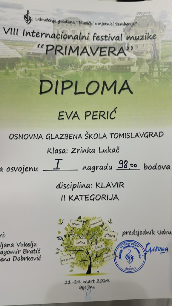 Našu školu dana 21.ožujka, predstavila je učenica trećeg razreda osnovne glazbene škole Eva Perić (II. kategorija), u klasi prof. Zrinke Lukač te je u disciplini glasovir osvojila visoku prvu nagradu s ukupno 98 bodova.