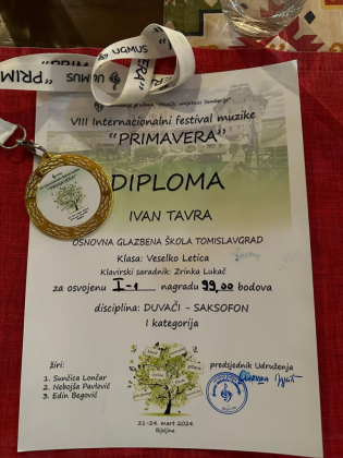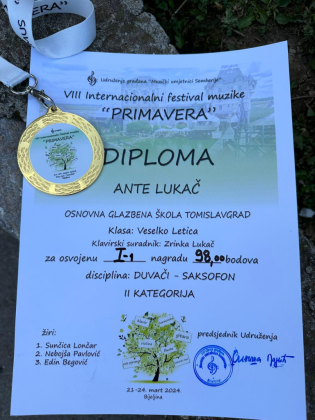 Danas su nam naši vrijedni puhači (saksofon, flauta) donijeli ponovno prve nagrade. Učenik četvrtog razreda, Ante Lukač u klasi profesora Veselka Letice je u svojoj (II.) kategoriji osvojio naslov pobjednika i proglašen najboljim s visokih 98 bodova.