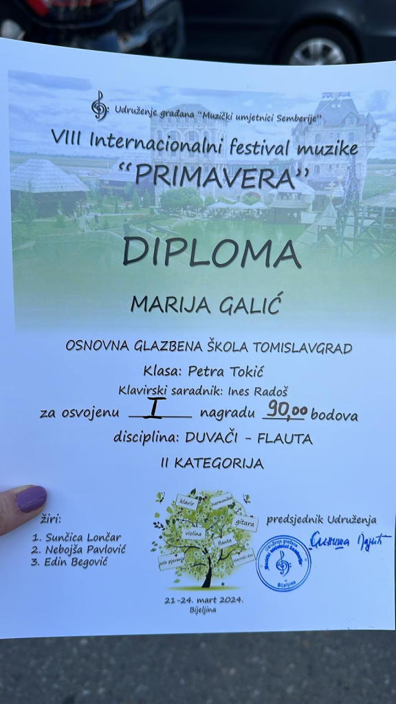 Isti naslov, pobjednika svoje (I.) kategorije, učenik drugog razreda Ivan Tavra, u klasi profesora Veselka Letice ostvario je rezultat od 99 bodova i tako proglašen najboljim za svoju kategoriju. Saksofoniste je na glasoviru pratila prof. Zrinka Lukač. Učenica trećeg razreda područne škole“ don Dominik Stojanović“ Kupres, Marija Galić u klasi profesorice Petre Tokić je na flauti osvojila prvu nagradu s ukupno 90 bodova. Mariju je na glasoviru pratila prof. Ines Radoš.