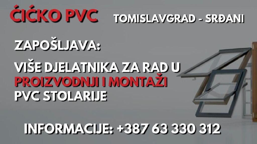 Naslovnica Obavijesti/ Najave Ćićko PVC zapošljava više djelatnika za rad u proizvodnji i montaži PVC... Obavijesti/ NajaveOglasi Ćićko PVC zapošljava više djelatnika za rad u proizvodnji i montaži PVC stolarije Objavio TC - 7. siječnja 2026. Ćićko PVC zapošljava više djelatnika za rad u proizvodnji i montaži PVC stolarije 📍Tomislavgrad – Srđani Sve informacije na broj: +387 63 330 312 VEZANI ČLANCIVIŠE OD AUTORA Najava: Zakazana 23. sjednica Skupštine HBŽ Objavljeni javni pozivi za razvoj turizma u FBiH Tražite siguran i stabilan posao? 3N Grill zapošljava! Međunarodna nagrada Luciji Zorić 19. travnja 2026. Pronađen ključ ispred Franjevačkog samostana u Tomislavgradu 19. travnja 2026. Matica hrvatska Travnik ustanovljuje nagradu „Ivo Andrić“ 17. travnja 2026. Učenici Srednje glazbene škole Tomislavgrad briljirali na Federalnom natjecanju u Srebreniku 17. travnja 2026. U Livnu će se graditi nova bolnica, investicija vrijedna 48 milijuna... 17. travnja 2026.