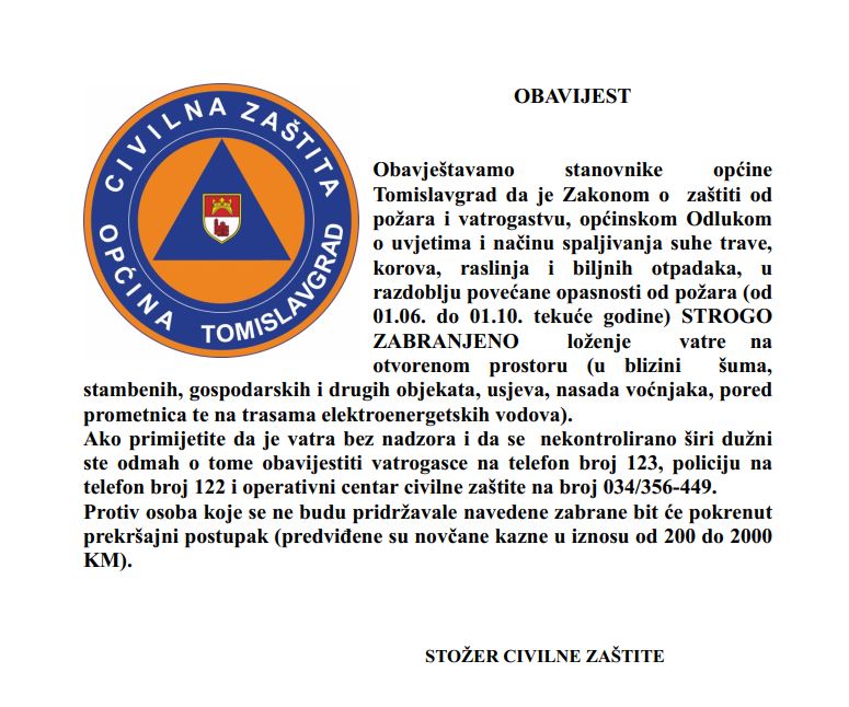 Stožer Civilne zaštite Općine Tomislavgrad podsjeća stanovništvo da je važećim propisima zabranjeno paljenje vatre na otvorenome u razdoblju od 1. lipnja do 1. listopada.