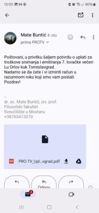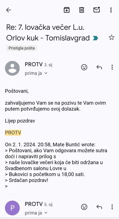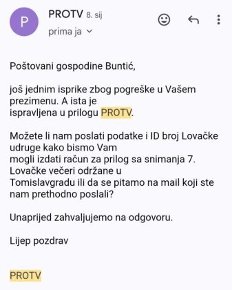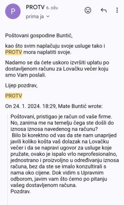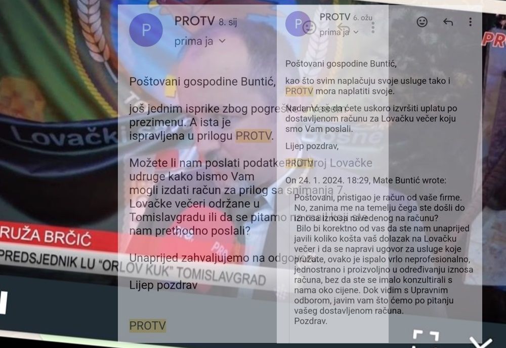 Naime, prije samog održavanja lovačke večeri, dana 2. siječnja 2024. šaljem E-mail PRO TV-u u kojemu ga pozivam da ako su zainteresirani, dođu snimiti prilog s Lovačke večeri koja se održava 3. siječnja u svadbenom salonu Lovre u Bukovici. Iz PRO TV-a zahvaljuju na pozivu i šalju obavijest da će doći snimiti prilog, pri tome ne spominjući koliko koštaju usluge snimanja, emitiranja, itd. Dakle, nema niti spomena da uopće naplaćuju svoje dolaske i svoje tv priloge. Ako gospodin vlasnik PRO TV-a ima ikakav dokaz da smo nešto unaprijed dogovorili, odnosno kako se navodi da smo dogovorili iznos od 700 KM, neka isti pokaže. Budući da ga nema, ne može ga ni pokazati! Ono što mi imamo pokazati je sadržaj E-maila od 2. siječnja 2024. g. (Vidi i u foto galeriji)