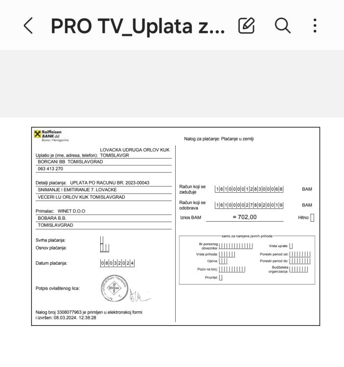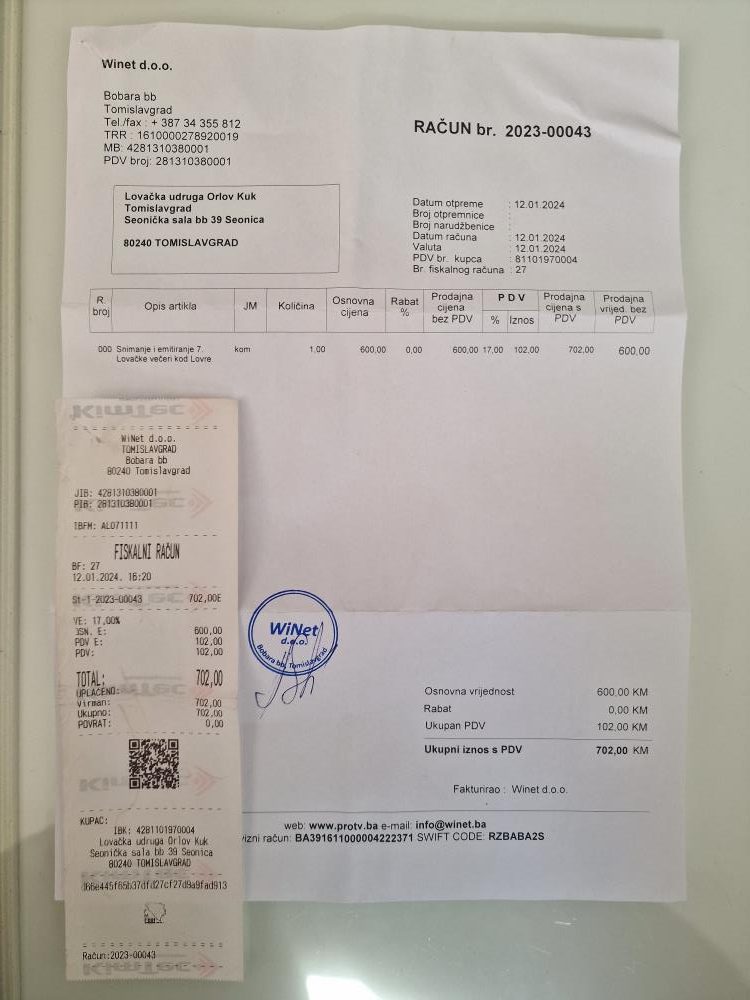 No, nastavimo dalje. U objavi koju je prenijela borak.tv se navodi se sljedeće: Nakon samog događaja dogodila se zanimljivost koja se rijetko viđa na ovim prostorima. Naime, organizator događaja je dostavio televiziji iz Tomislavgrada račun za uplatu od 300 KM. , detaljno opisujući stavke u računu koji je poslala Lovačka udruga „Orlov kuk“ – Tomislavgrad PRO TV za pružene im usluge, izbjegavajući navesti što se u međuvremenu događalo nakon što smo im poslali podatke Udruge da mogu napraviti račun. Prije nego navedemo što se u međuvremenu događalo u našoj korespondenciji s PRO TV-om, moramo kazati da je zaista profesionalno od vlasnika PRO TV-a koji javno odaje poslovne tajne i javno prikazuje stvari koje nisu za javnost, ne poštujući minimum profesionalne etike i etike u medijima i medijskom izvještavanju, tjerajući i nas da i mi kažemo neke stvari koje nisu za širu javnost, ali ovdje zahtijevaju da se zna što je istina i da speremo ljagu koju PRO TV baca na našu Udrugu.