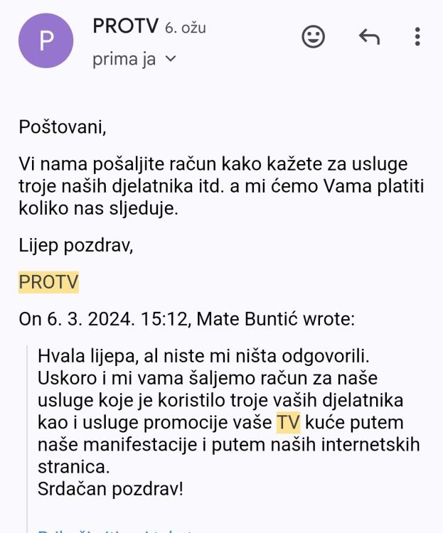 Revoltirani ovakvim odgovorom i ponašanjem PRO TV-a, šaljem odgovor PRO TV-u da ćemo onda i mi naplatiti svoje usluge koje smo pružili PRO TV-u i njegovim djelatnicima, jer svatko naplaćuje svoje usluge kako su oni naveli. Od PRO TV-a dobivamo odgovor da im pošaljemo račun i da će platiti koliko ih sljeduje.