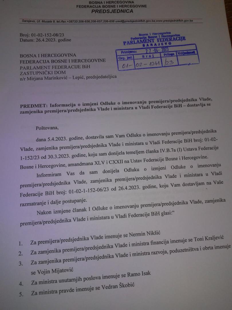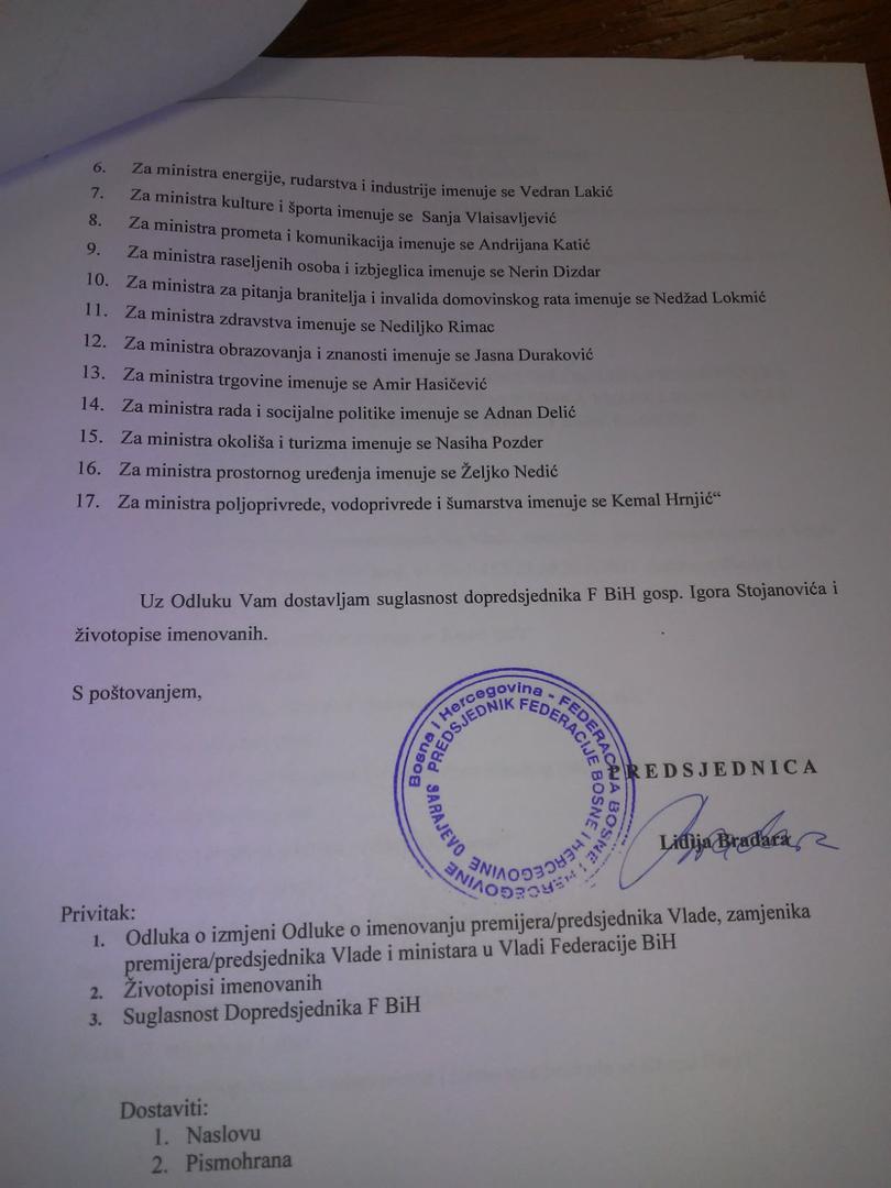 Predsjednica Federacije BiH Lidija Bradara dostavila je Zastupničkom domu Parlamenta Federacije BiH popis s imenima pojedinih novih kandidata za ministre u Vladi Federacije BiH, čime je definirana nova koalicija koja bi trebala uspostaviti izvršnu vlast na čijem bi čelu trebao biti Nermin Nikšić, šef SDP-a, prenosi Večernji list BiH.