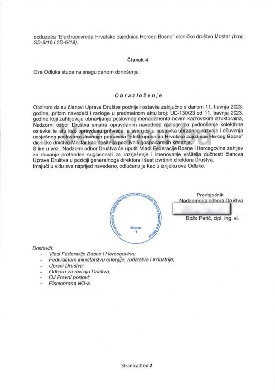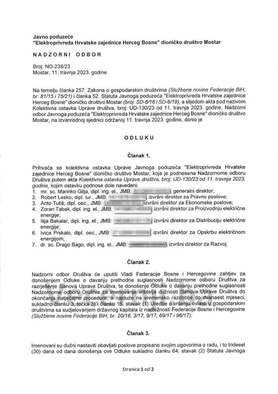 Nadzorni odbor prihvatio je ostavke generalnog direktora Marinka Gilje, izvršnog direktora za pravne poslove Roberta Leske, izvršnog direktora za ekonomske poslove Ante Tutiša, izvršnog direktora za proizvodnju električne energije Zorana Tabaka, izvršnog direktora za distribuciju električne energije Ilije Bakalara, izvršnog direktora za opskrbu električnom energijom Ivice Prskala i izvršnog direktora za razvoj Drage Bage. Nadzorni odbor će uputiti Vladi Federacije BiH zahtjev za donošenje odluke od davanju prethodne suglasnosti za razrješenje članova Uprave te Odluke o davanju suglasnosti za imenovanje vršitelja dužnosti do okončanja natječajne procedure, najduže do 12 mjeseci.