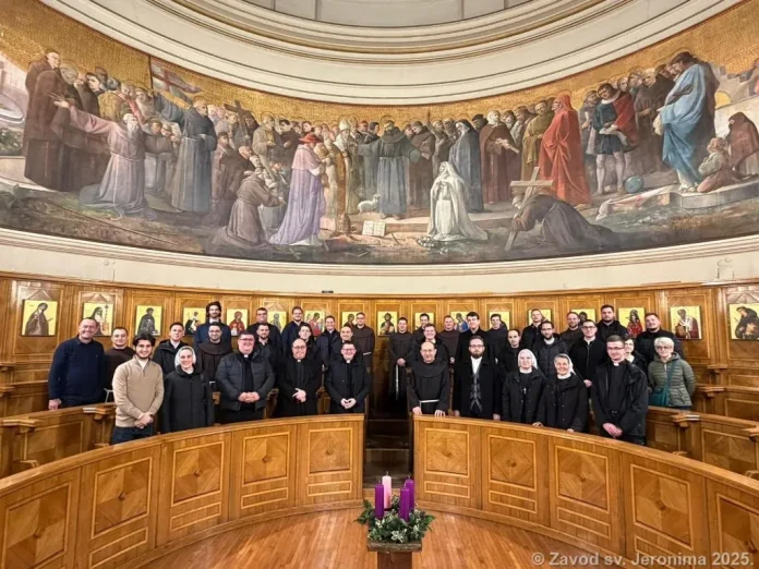 U subotu 29. studenoga 2025. održana je redovita mjesečna duhovna obnova članova Zavoda sv. Jeronima u Međunarodnom zavodu „Antonianum“ (Collegio Internazionale S. Antonio) u Rimu. Na duhovnoj obnovi sudjelovali su svećenici-studenti predvođeni rektorom Markom Đurinom, duhovnik p. Alan Modrić, redovnice i djelatnice Zavoda. Duhovna je obnova započela razgledavanjem crkve i samog Zavoda u čemu je domaćin zavodskoj zajednici bio gvardijan fra Miljenko Šteko, OFM. Svećenici studenti upoznati su također i s radom Papinske međunarodne marijanske akademije čiji je osnivač i dugogodišnji predsjednik bio naš franjevac fra Karlo Balić OFM. Djelovanje akademije predstavio je njezin današnji predsjednik fra Stefano Cecchin, OFM. Nakon razgledavanja uslijedio je nagovor duhovnika p. Modrića, nakon čega je uslijedila mogućnost za ispovijed, osobnu molitvu i razmatranje te je potom slavljena misa.