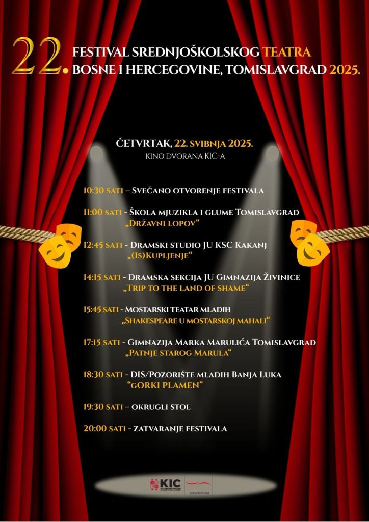 Tomislavgrad će sutra biti domaćin 22. Festivala srednjoškolskog teatra. Program će početi svečanim otvaranjem u 10.30, nakon čega će posjetitelji moći pogledati predstavu “Državni lopov” u izvedbi tomislavgradske Škole mjuzikla i glume. Uz predstave gostujućih skupina iz Mostara, Banja Luke, Živinica i Kaknja, izdvajamo i predstavu naših gimnazijalaca “Patnje mladog Marula” te “Gorki Plamen” pisan prema scenariju naše Šime Majić Josipović i u suradnji s Novicom Bogdanovićem.