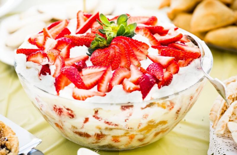 - U hladno mlijeko stavite ekstrakt vanilije i pomiješajte. Umočite svaku piškotu kratko u mlijeko i posložite na dno pripremljene posude. Kada ste popunili dno piškotama, stavite na njih par žlica kreme i zatim red jagoda. Ponavljajte dok ne iskoristite sve sastojke, a završite s kremom navrh koje ćete posložiti još malo jagoda. Stavite u hladnjak na nekoliko sati i zatim poslužite.