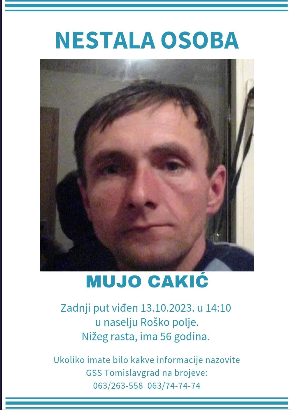 Iz Gorske službe spašavanja Tomislavgrad javljaju da je jučer nestao pedesetšestogodišnji Mujo Cakić iz Novoga Travnika. Zadnji put je viđen u petak, 13. listopada, u 14:10 u Roškom Polju.