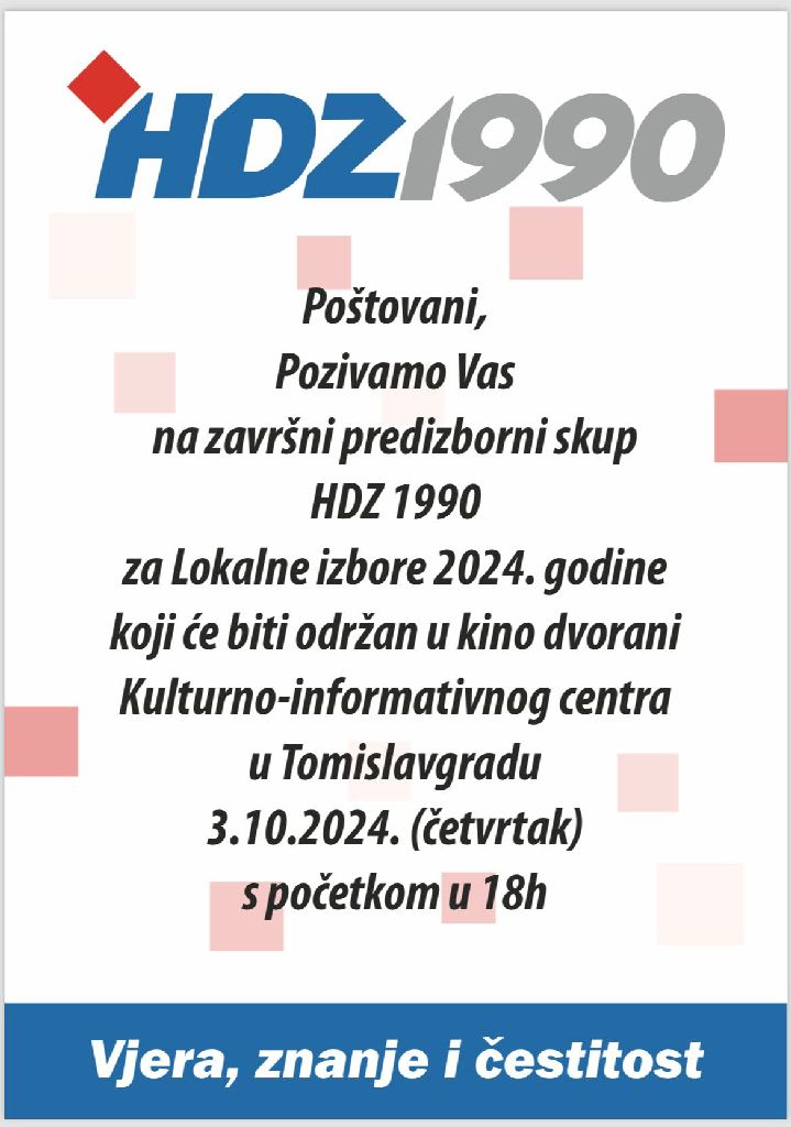 pozivamo Vas na završni predizborni skup HDZ 1990 za Lokalne izbore 2024. godine koji će biti održan u kino dvorani Kulturno-informativnog centra u Tomislavgradu u četvrtak, 3. listopada 2024. godine s početkom u 18 sati.