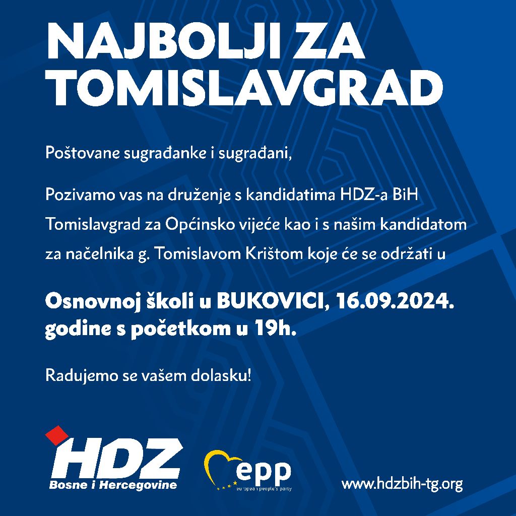 pozivamo vas na druženje s kandidatima HDZ-a BiH Tomislavgrad BiH za Općinsko vijeće kao i s našim kandidatom za načelnika g. Tomislavom Krištom koje se održati u Osnovnoj školi u Bukovici, 16.9.2024. godine s početkom u 19 h.