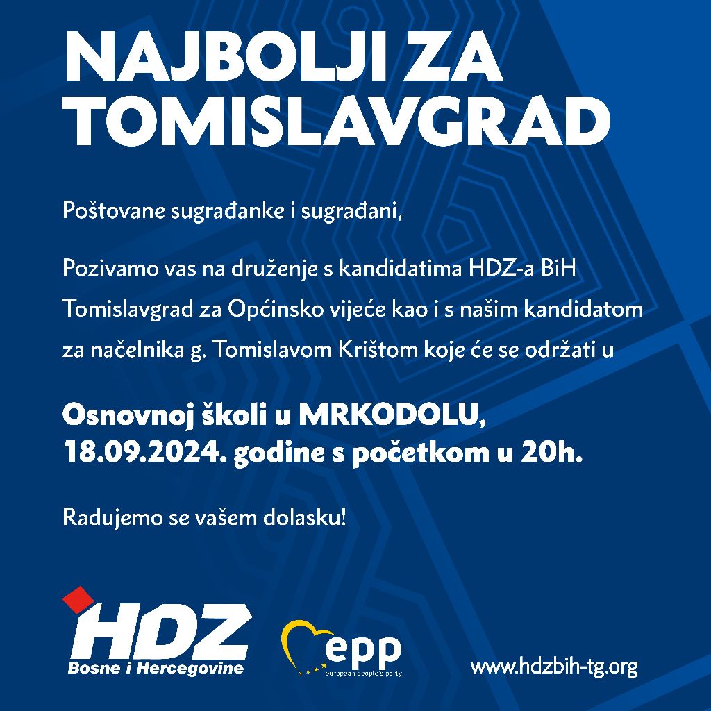 pozivamo vas na druženje s kandidatima HDZ-a BiH Tomislavgrad BiH za Općinsko vijeće kao i s našim kandidatom za načelnika g. Tomislavom Krištom koje se održati u Osnovnoj školi u Brišniku, 18.9.2024. godine s početkom u 18 h, te u Osnovnoj školi u Mrkodolu s početkom u 20 sati.