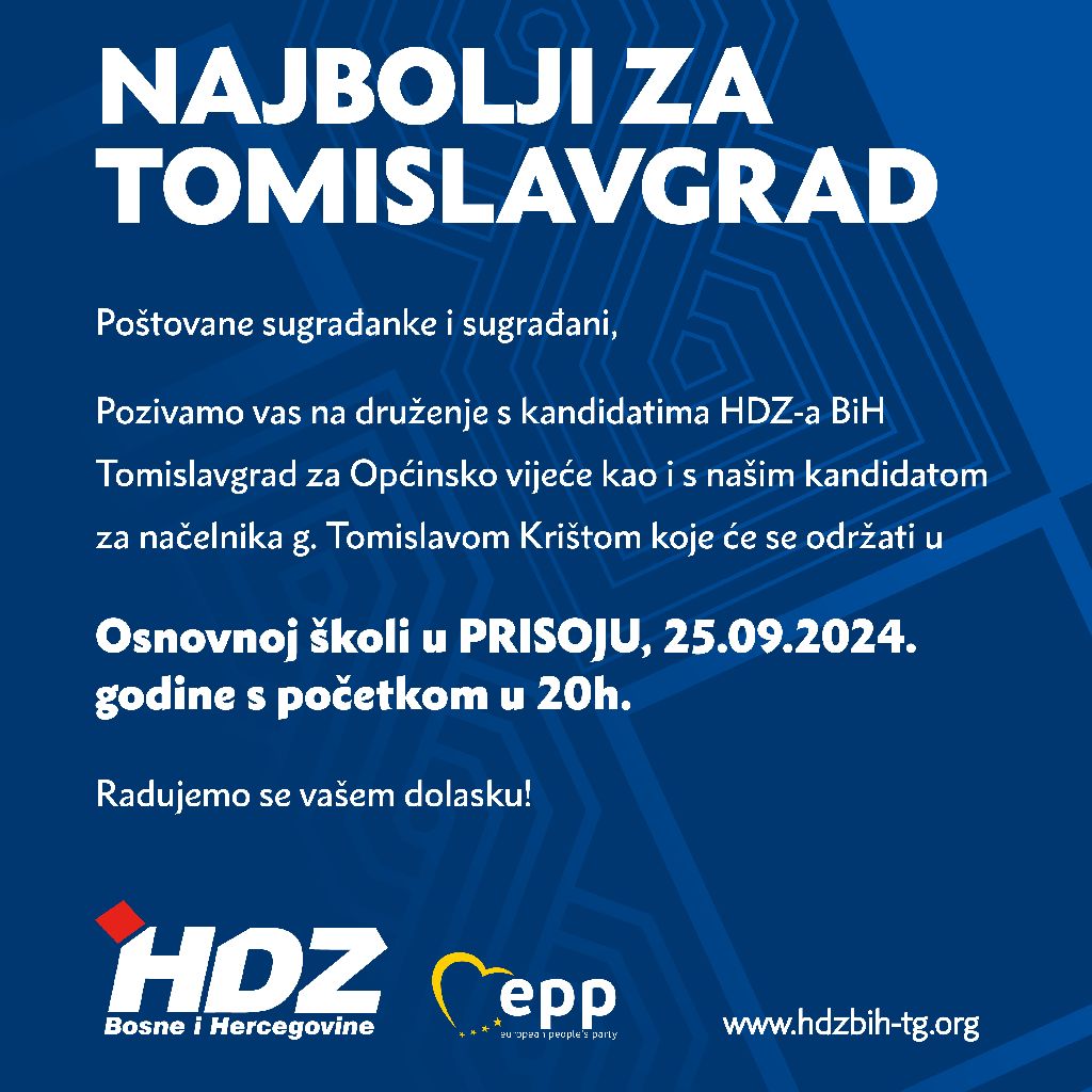 pozivamo vas na druženje s kandidatima HDZ-a BiH Tomislavgrad BiH za Općinsko vijeće kao i s našim kandidatom za načelnika g. Tomislavom Krištom koje će se održati u Osnovnoj školi u Stipanićima, 25. 9. 2024. godine s početkom u 18 sati, te u Osnovnoj školi u Prisoju u 20 sati.