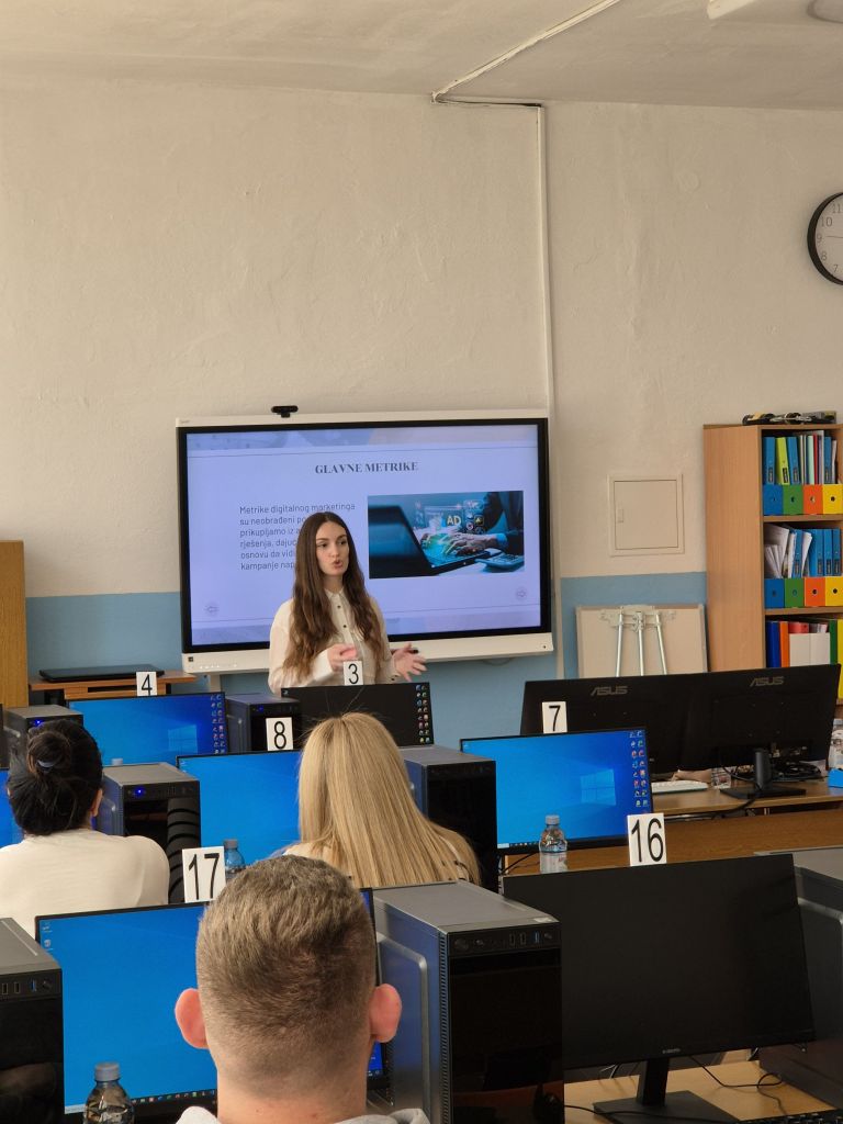 Druga radionica, koja je održana upravo danas obuhvatila je društvene mreže i osnovne tehnike digitalnog marketinga. Predavačica Antonija Kožul, studentica 3. godine Računarstva, upoznala je sudionike s osnovama upravljanja društvenim mrežama, od prve objave do postavljanja oglasa.