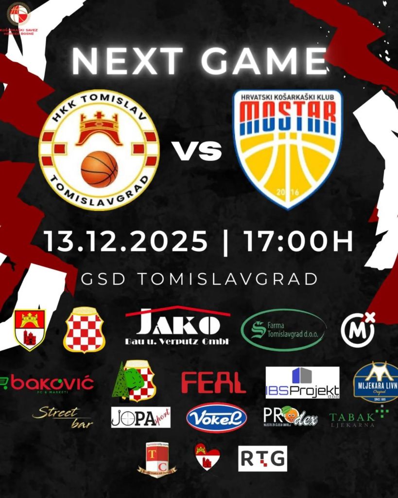 Košarkaši HKK Tomislav u subotu, 13. prosinca 2025., od 17 sati dočekuju ekipu HKK Mostar u sportskoj dvorani Tomislavgrad u sklopu VII. kola Lige KS HB. Bit će to ujedno i posljednja domaća utakmica za Tomislav u ovoj kalendarskoj godini.