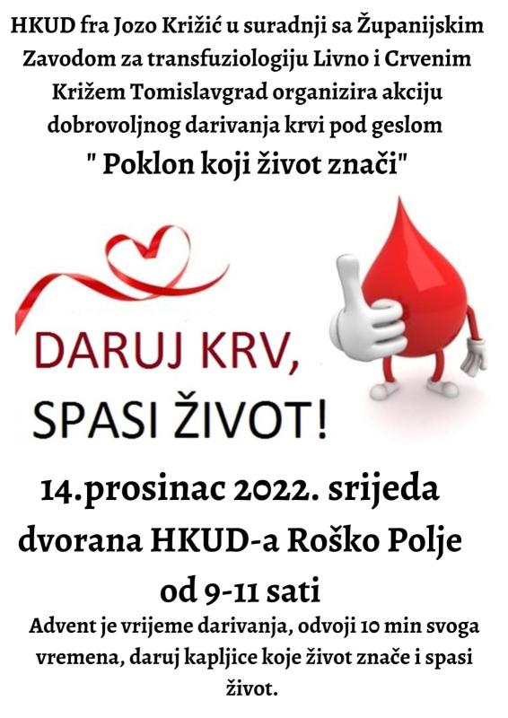 Akcija će se održati 14. prosinca 2022. godine u dvorani HKUD “Fra Jozo Križić” u vremenu od 9 do 11 sati.