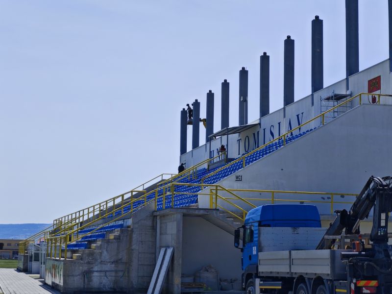 Danas su na novoj tribini na stadionu HNK Tomislav počeli pripremni radovi za postavljanje krovne konstrukcije. Ako pri izvođenju radova ne bude kakvih velikih iznenađenja, tribina bi pod krovom trebala biti najkasnije do 15. kolovoza.