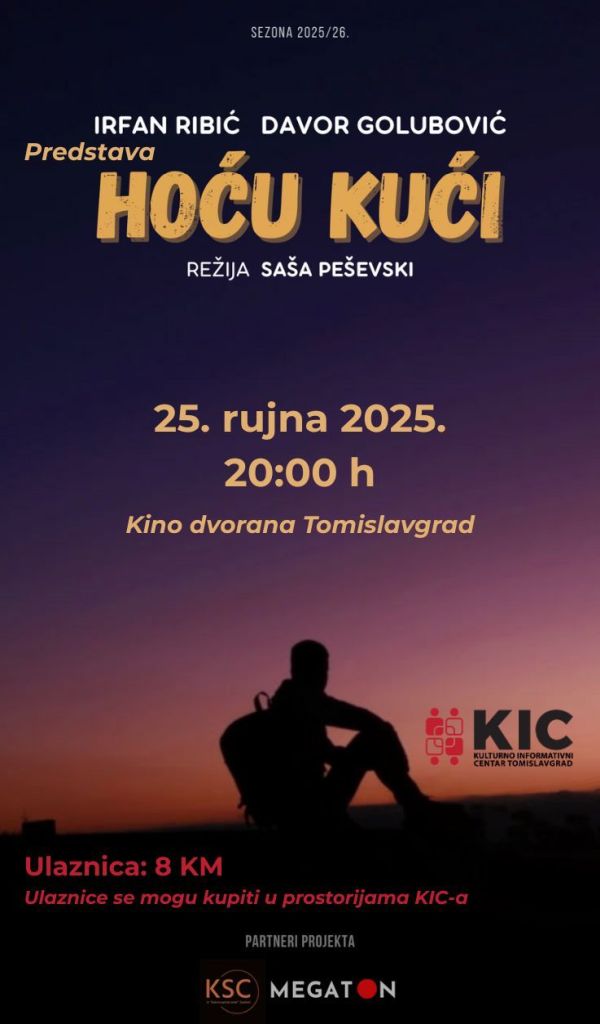 Naslovnica Najnovije vijesti “Hoću kući” – nova predstava u tomislavgradskom KIC-u Najnovije vijesti “Hoću kući” – nova predstava u tomislavgradskom KIC-u Objavio TC - 22. rujna 2025. U četvrtak, 25. rujna u tomislavgradskom KIC-u očekuje vas predstava “Hoću kući”. Početak predstave zakazan je za 20 sati, a ulaznice po cijeni od 10 KM možete nabaviti u prostorijama KIC-a. https://tomislavcity.com/wp-content/uploads/2025/09/WhatsApp-Video-2025-09-22-at-11.32.52.mp4 “ VEZANI ČLANCIVIŠE OD AUTORA Preminula heroina Sarafina Lauš: Preživjela je logore i gubitak tri sina i muža, ali pravdu nikada nije dočekala Potpisan ugovor o nabavi informatičke opreme za Općinski sud u Tomislavgradu Najava: Zakazana 23. sjednica Skupštine HBŽ Preminula heroina Sarafina Lauš: Preživjela je logore i gubitak tri sina... 16. travnja 2026. Potpisan ugovor o nabavi informatičke opreme za Općinski sud u Tomislavgradu 16. travnja 2026. Najava: Zakazana 23. sjednica Skupštine HBŽ 16. travnja 2026. Najava predstavljanja knjige „Jeruzalemski muftija El Huseini i Muslimani BiH –... 16. travnja 2026. Pronađen novčanik u Marketu Baković 16. travnja 2026.