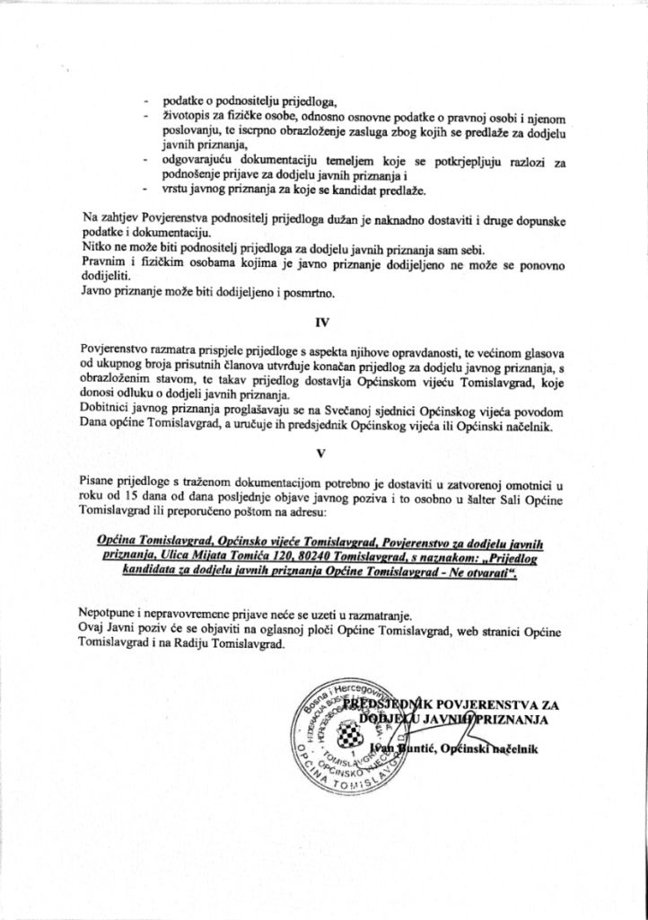 Javni poziv za podnošenje prijedloga kandidata za dodjelu javnih priznanja Općine Tomislavgrad