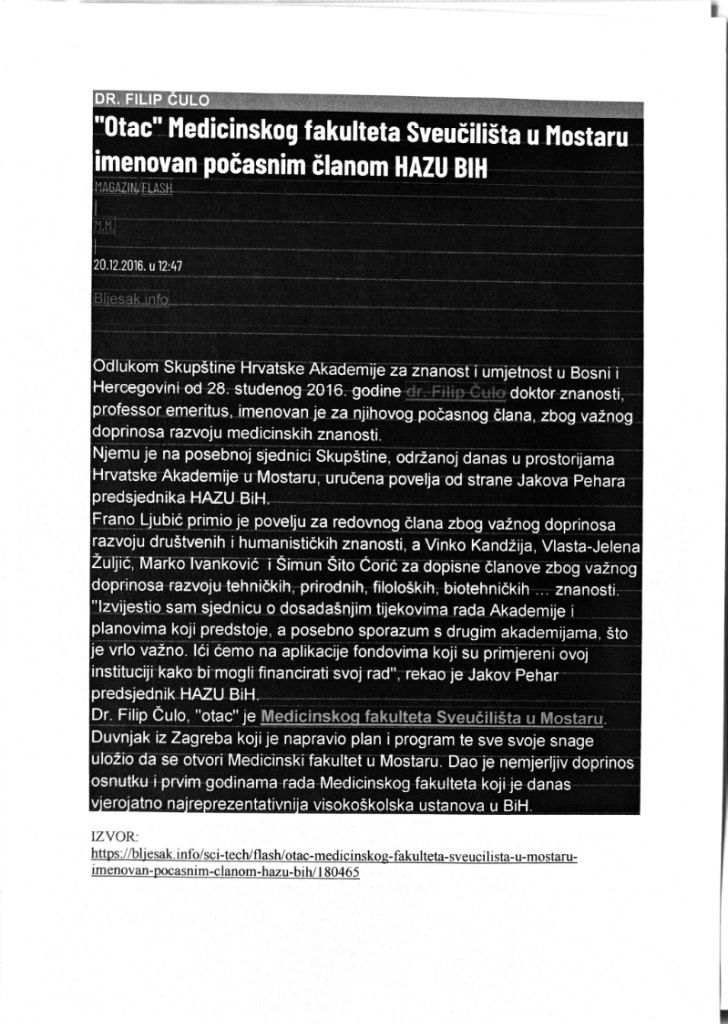 Članak objavljen na portalu Bljesak, od 20.12.2016. godine o dr. Filipu Čuli