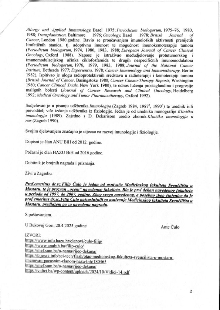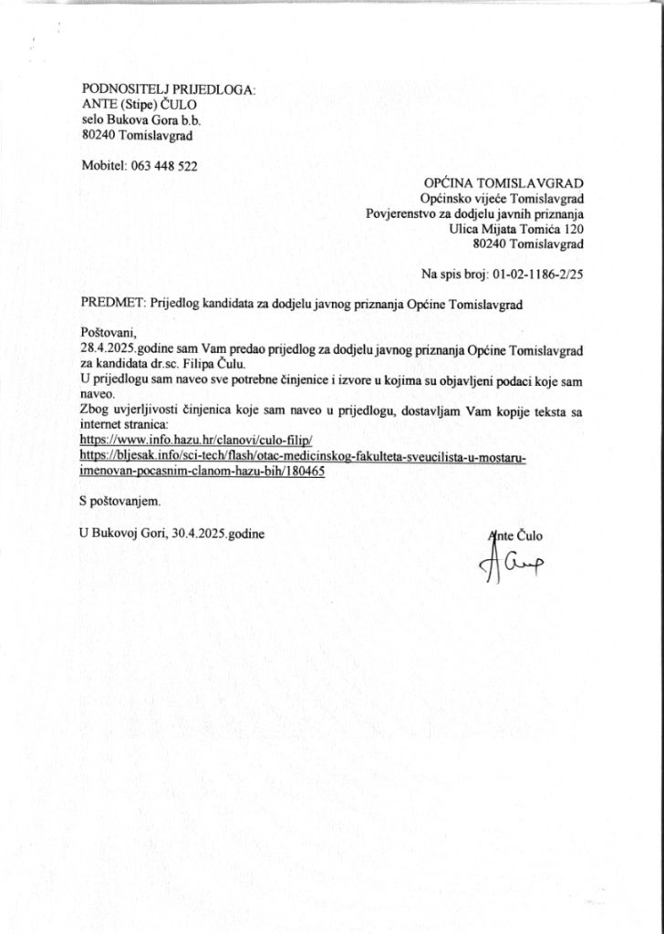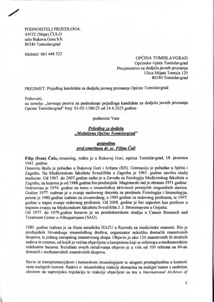 Ante Čulo – Prijedlog od 28.4.2025. godine da se “Medaljon Općine Tomislavgrad” dodijeli gosp. emeritusu dr. sc. Filipu (Ivana) Čuli.