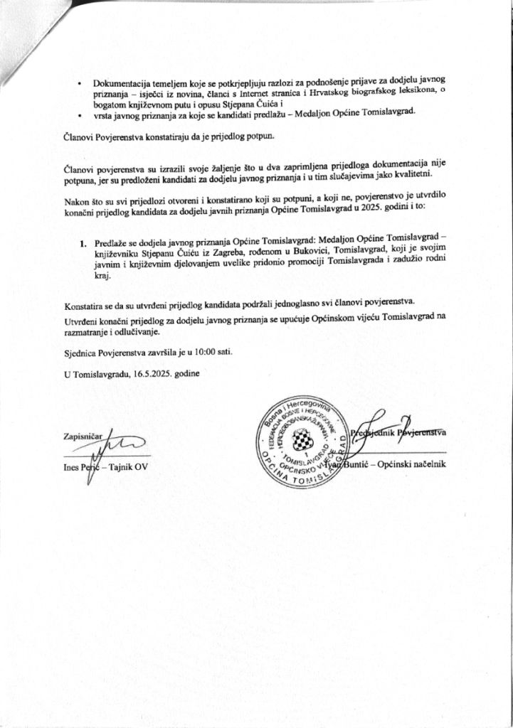 Zapisnik o otvaranju pristiglih prijedloga na Javni poziv za podnošenje prijedloga kondidata za dodjelu javni priznanja Općine Tomislavgrad