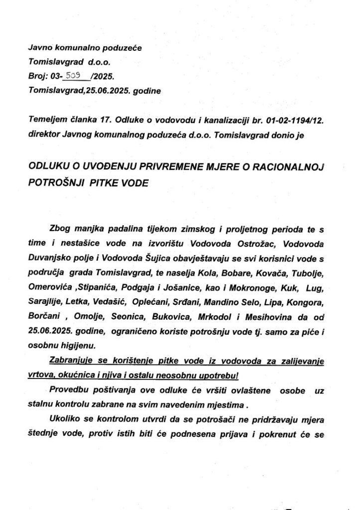 JKP Tomislavgrad donijelo je Odluku o uvođenju privremene mjere o racionalnoj potrošnji pitke vode. Kako se navodi u obrazloženju, spomenuta odluka uvedena je zbog manjka oborina tijekom zimskoga i proljetnoga razdoblja i nestašice vode na izvorištima: Ostrožac, Duvanjsko polje i Šujica.