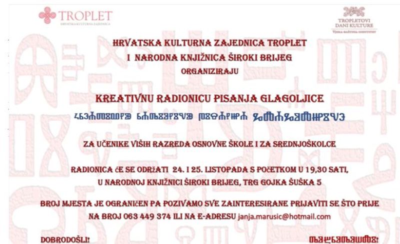 U okviru Tropletovih dana kulture – vjera, baština, identitet, Hrvatska kulturna zajednica Troplet u suradnji s Narodnom knjižnicom Široki Brijeg organizira kreativnu radionicu pisanja glagoljice za učenike viših razreda osnovnih škola i srednjoškolce.