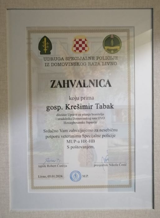 Predstavnici udruge Specijalne jedinice policije Domovinskoga rata HVO – HB danas su u Tomislavgradu uručili zahvalnicu Krešimiru Tabaku, nedavno imenovanome ravnatelju Uprave za pitanja branitelja i stradalnika Domovinskoga rata HVO-a Hercegbosanske županije.