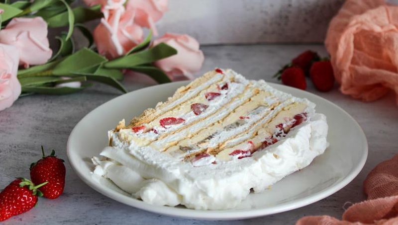- Na tacnu stavi jednu koru te premaži jednom trećinom kreme. Posloži voće po želji (jagode), zatim po voću stavi jednu trećinu šlaga. Ponovo stavi drugu koru, posloži voće (banane) i šlag. Stavi treću koru, voće po želji i preostali šlag.
