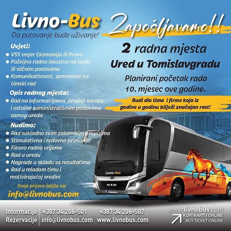 Livno-Bus planira početkom 10. mjeseca otvoriti ured u Tomislavgradu. Sukladno tome raspisuje natječaj za prijem dvije osobe za rad u ovome uredu.