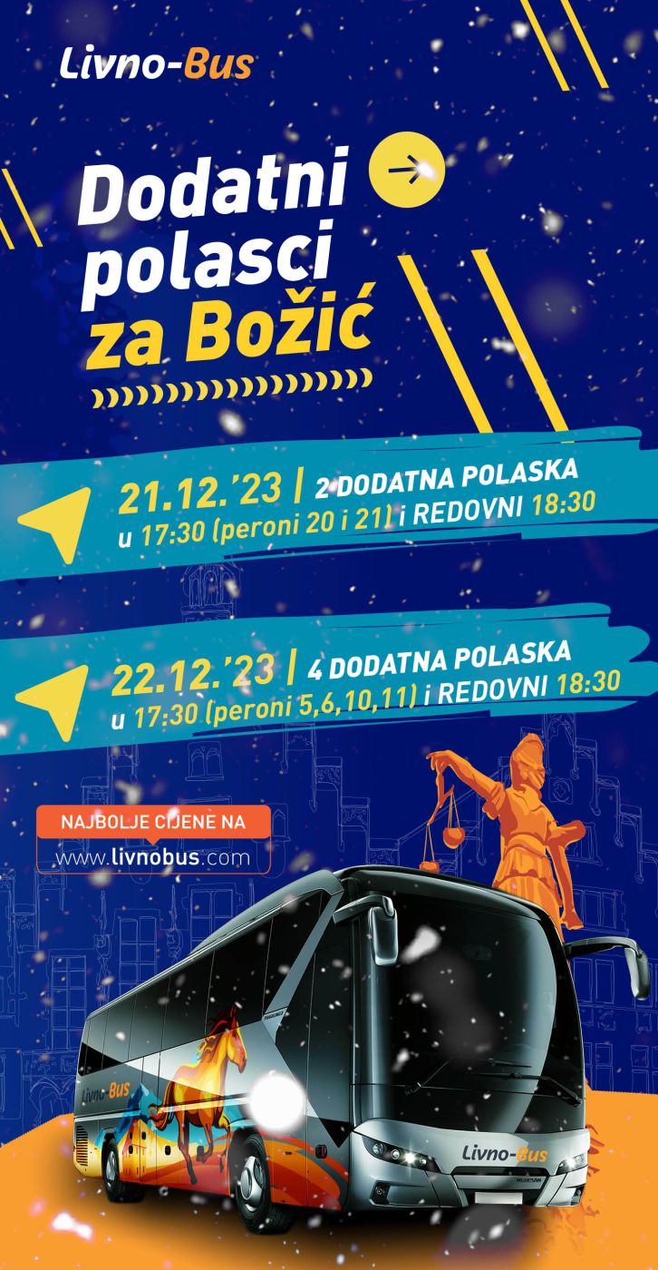 Naslovnica Obavijesti/ Najave Livno-Bus za Božić uvodi nove polaske autobusa iz Njemačke za BiH Obavijesti/ Najave Livno-Bus za Božić uvodi nove polaske autobusa iz Njemačke za BiH Objavio TCity - 13. prosinca 2023. Kako bi odgovorili na sve zahtjeve i omogućili svima dolazak kući za Božić, Livno-Bus uvodi nove polaske iz Njemačke za BiH. Više o satnici i datumima pogledajte na priloženom plakatu. Sponzorirani članak VEZANI ČLANCIVIŠE OD AUTORA Duvnjaci za Duvno – Humanitarna ruta za pomoć ugroženim obiteljima duvanjskoga kraja Auto klub “Tomislav” prodaje zemljište u Tomislavgradu Potražujemo zemljište na području Tomislavgrada Završeni 63. Šimićevi susreti – glavna nagrada svečano dodijeljena Miji Tokiću 24. travnja 2026. Baba Penavuša: Raison de vivre – otvorenje izložbe u Franjevačkome muzeju... 24. travnja 2026. Obavijest Federalnog ministarstva o neradnim danima zbog Praznika rada 24. travnja 2026. Objavljena Preliminarna lista korisnika za Program poticanja i osnaživanja žena u... 24. travnja 2026. EU lansirala aplikaciju za brzi prelazak granice: Ovo su podaci koje... 24. travnja 2026.
