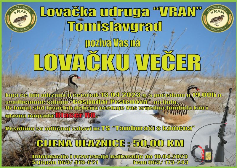 Lovačka udruga “Vran” Tomislavgrad u četvrtak, 13. travnja 2023. godine organizira lovačku večer u svadbenom salonu “Gospodar prstenova” na Kolu, općina Tomislavgrad. Početak druženja je u 19 sati.
