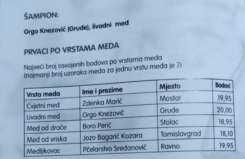 Pobjednik 7. Dana hercegovačkog meda je Grgo Knezović s Ledinca, iz općine Grude, s medom Livada, javlja portal Herc.info.