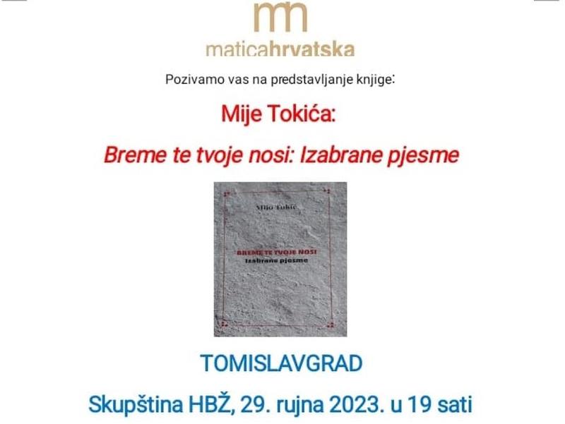 Matica hrvatska Tomislavgrad poziva na predstavljanje knjige prof. Mije Tokića: “Breme te tvoje nosi – izabrane pjesme”.