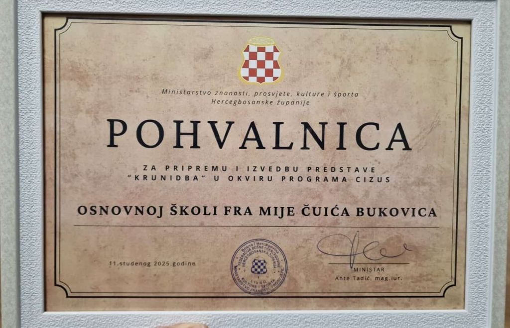 Dramska skupina Centra izvrsnosti, znanja, umijeća i sposobnosti Hercegbosanske županije čije je središte u Osnovnoj školi fra Mije Čuića u Bukovici polučila je ogroman uspjeh izvedbom predstave Krunidba. U sklopu proslave 1100 godina Hrvatskog Kraljevstva predstava je ,nakon premijere u Tomislavgradu, izvođena u brojnim gradovima Hrvatske, Bosne i Hercegovine pa čak i u Austriji, a privukla je pažnju mnogih hrvatskih medija. Izazvala je oduševljenje publike i dobila pohvale struke stoga je ministar znanosti, prosvjete, kulture i športa Hercegbosanske županije Ante Tadić danas pohodio spomenutu školu kako bi odao priznanje svim članovima Dramske skupine.