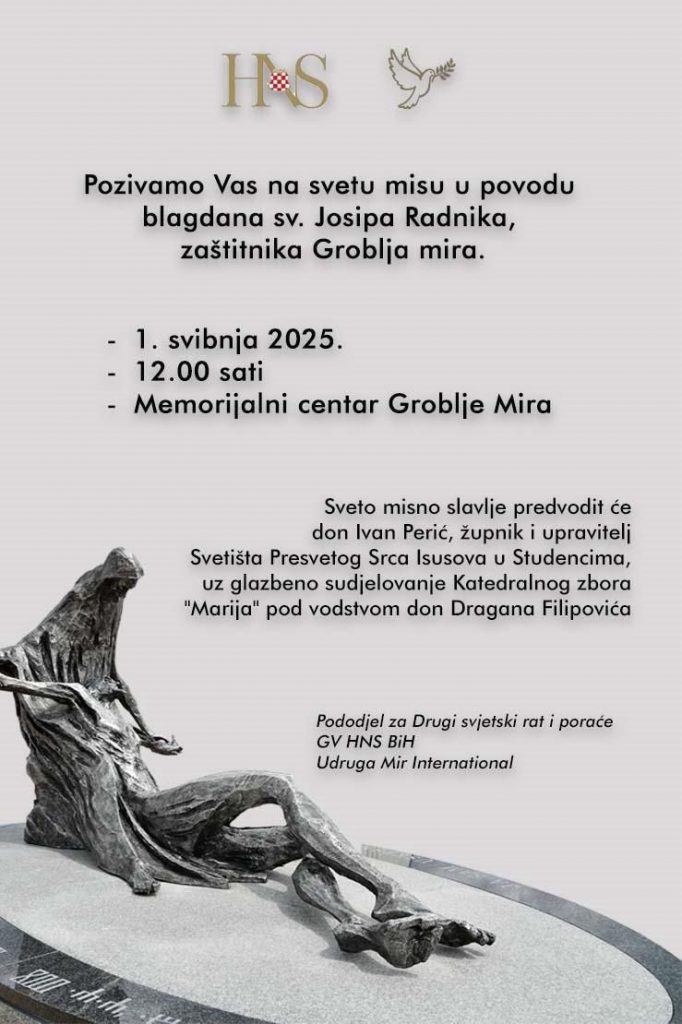 U crkvi svetog Josipa Radnika na Groblju mira na Bilima, župa Goranci, bit će služena sveta misa povodom blagdana svetog Josipa Radnika. Misa će biti služena na sam blagdan, u četvrtak, 1. svibnja, s početkom u 12.00 sati.