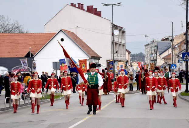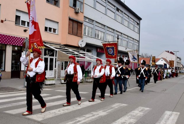 Drugog dana boravka članovi družine sudjelovali su u svečanom mimohodu povijesnih postrojbi ulicama grada Požege nakon kojeg su bili postrojeni zajedno sa svojim kolegama na Katedralnom trgu ispred požeške Stolne crkve sv. Terezije Avilske gdje su predali prijavak gradonačelniku Požege dr.sc. Željku Glaviću. Posebna je to svečanost koja se njeguje dugi niz godina, a momci iz Hajdučke družine Mijata Tomića iz godine u godinu plijene pozornost kod Požežana i njihovih gostiju s prekrasnom odorom koju nose.