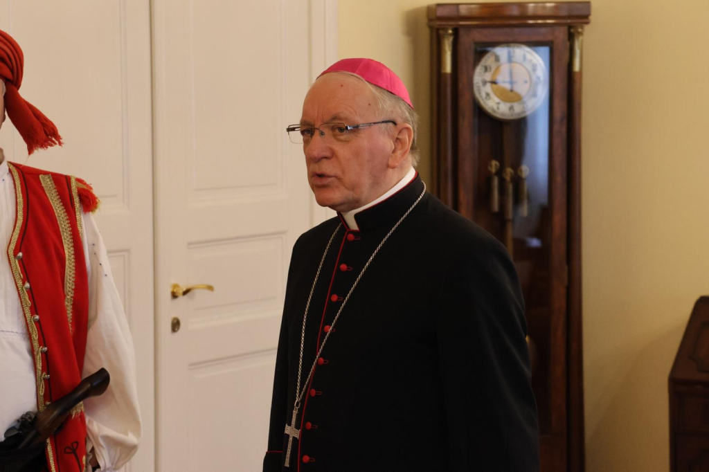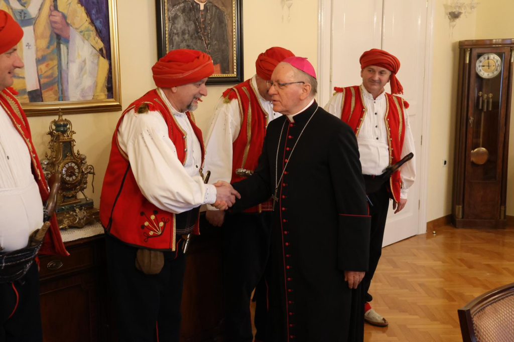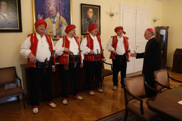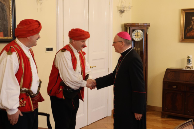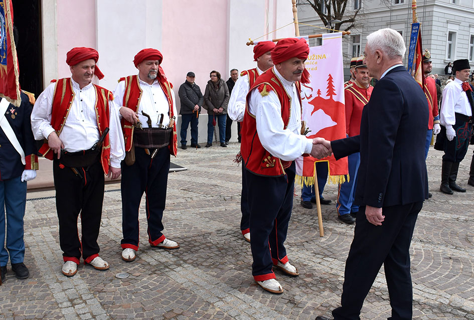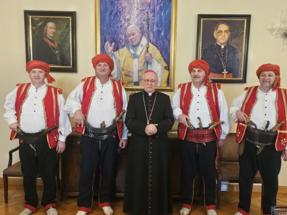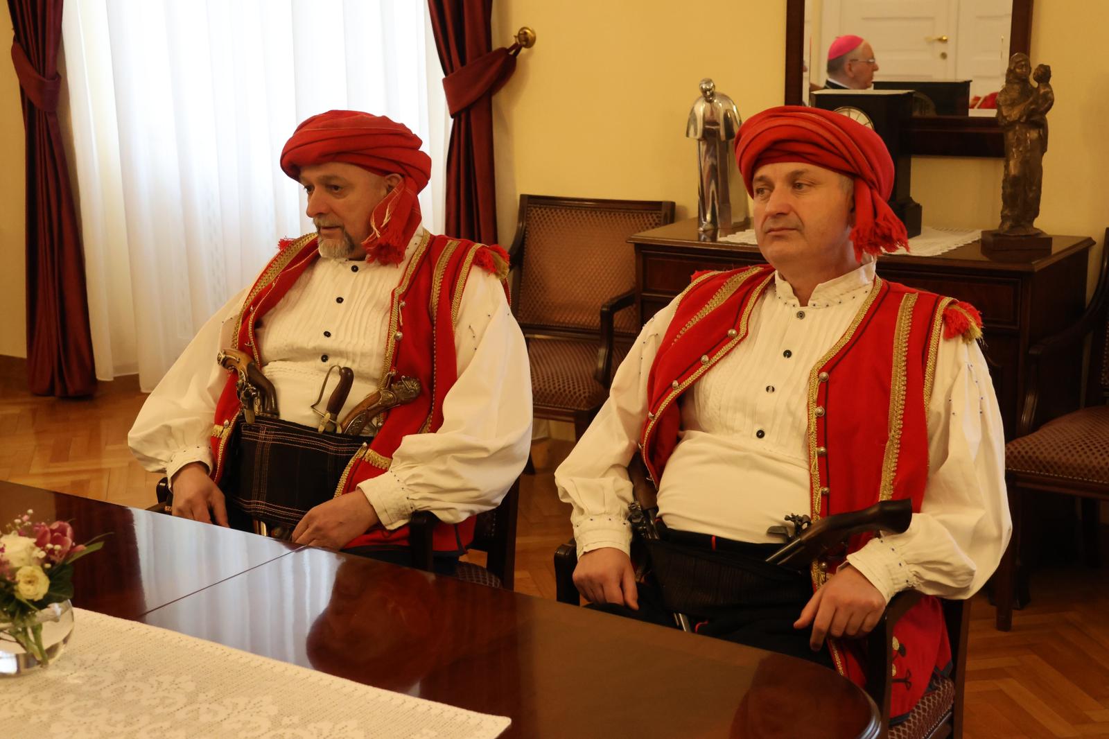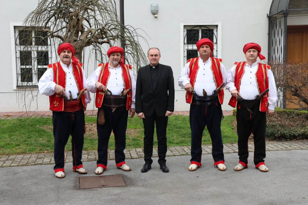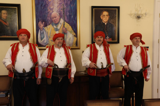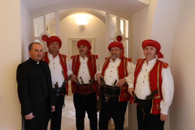 Prije svečanog mimohoda družini je bio upriličen prijem u požeškom Biskupskom ordinarijatu gdje ih je prvo primio prepošt Stolnog Kaptola Požeške biskupije prečasni Ivica Žuljević, a nakon toga i apostolski upravitelj Požeške biskupije, dosadašnji požeški biskup msgr. dr. Antun Škvorčević. U tim razgovorima između ostalog prisjetili su se boravka biskupa Škvorčevića na danima Nikole Tavelića u Tomislavgradu 2012. godine.