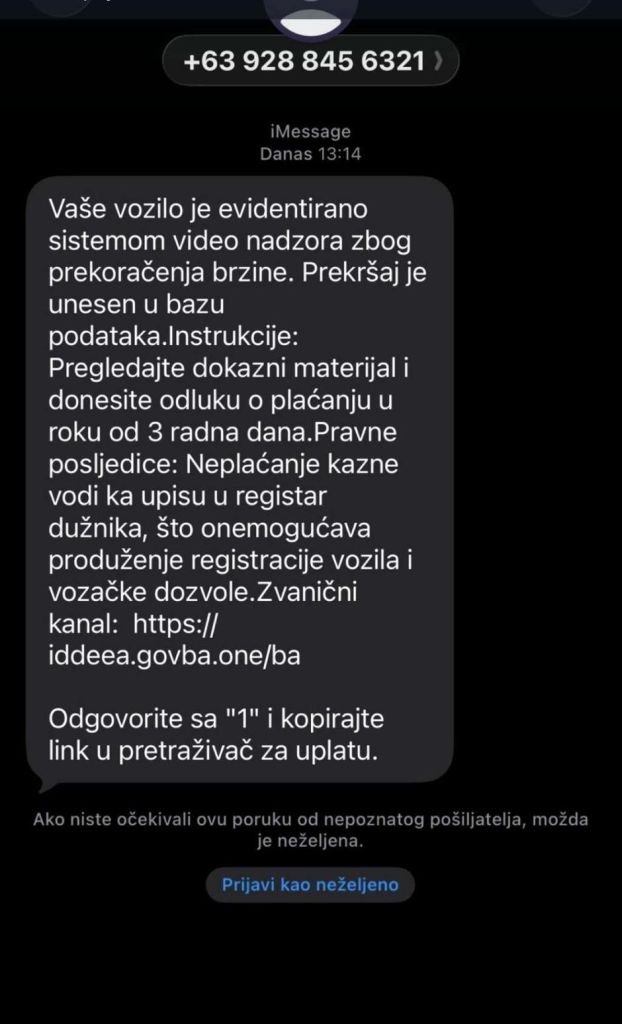 Uprava policije MUP-a HBŽ raspolaže informacijama o zaprimanju lažnih SMS poruka u kojima se nepoznate osobe lažno predstavljaju kao policijsko tijelo ili druga državna institucija te od primatelja zahtijevaju žurnu uplatu navodne novčane kazne, navodi se na mrežnim stranicama MUP-a HBŽ.